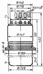 нагрева. Лампа может работать в схеме с общей сеткой. Оформление - металлостеклянное. Рабочее положение - вертикальное, стеклянным баллоном вверх. Охлаждение - принудительное: анода - водяное не менее 150 л/мин; ножки - воздушное не менее 100 м3/ч; баллона - воздушное не менее 120 м3/ч. Масса 8 кг |