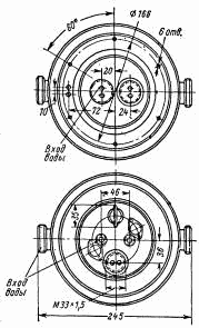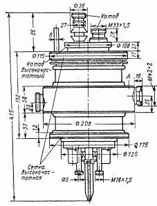 полосе частот. Оформление - металлокерамическое. Рабочее положение - вертикальное, выводами катода вверх. Охлаждение - принудительное: анода - водяное не менее 195 л/мин, каждого вывода катода - водяное не менее 5 л/мин, сетки - водяное не менее 100 л/мин, каждого вывода сетки - водяное не менее 3 л/мин. Масса 21 кг. |