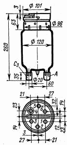 колебаний на частотах до 50 МГц. Оформление - стеклянное с цоколем. Рабочее положение - вертикальное, баллоном вверх. Охлаждение - естественное. Масса: 100 г. |