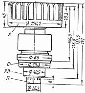 в дециметровом диапазоне частот при анодной модуляции. Оформление - металлокерамическое. Охлаждение - принудительное: анода - воздушное не менее 30 м3/ч, вывода катода не менее 3 м3/ч. Масса 1500 г. |