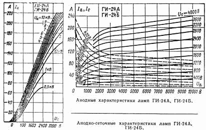 импульсной анодной модуляции. Оформление - металлостеклянное. Охлаждение - принудительное: ГИ-24А: анода - водяное не менее 50 л/мин, ножки - воздушное не менее 100 м3/ч, баллона - воздушное не менее 100 м3/ч; ГИ-24Б: анода - воздушное 600 м3/ч. Масса ГИ-24А 10 кг, ГИ-24Б 12 кг. |