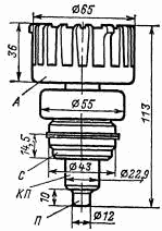 дециметровом диапазоне волн. Оформление - металлокерамическое с цилиндрическими выводами катода, подогревателя и сетки. Охлаждение - воздушное принудительное 24 м3/ч. Масса с радиатором 620 г, без радиатора 205 г. |
