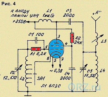 Колебательный контур L1С1 включен между анодом лампы и управляющей сеткой. Он обеспечивает положительную обратную связь каскада — одно из условий, необходимых для самовозбуждения генератора. Питание на анод лампы подается через колебательный контур (через отвод в катушке И). Выключатель SА1 служит для включения каскада в режим передачи и отключения в режиме приема.