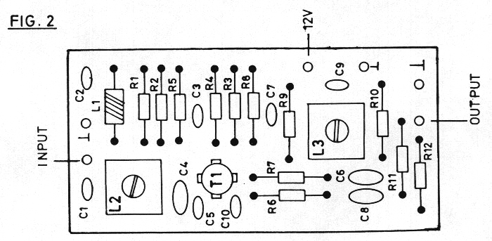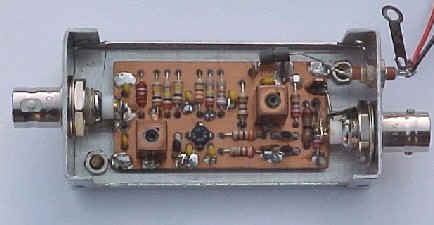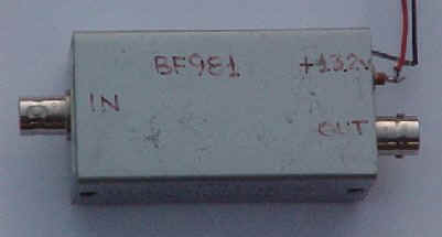 Усилитель собран на дешевом транзисторе BF981 фирмы PHILIPS с уровнем шума 1 дб, коэфициент усиления 23 дб. Вы можете использовать двухзатворные МОП транзисторы на основе арсенида галлия с еще более низким уровнем шума. Но это не оправдано по стоимости при применении на наземных линиях связи. Усилитель собран на печатной плате из двухстороннего стеклотекстолита размером 25x50 мм. Большая часть металлизации с обоих сторон сохраняется. Используется печатный монтаж. Внешние кабельные соединения построены на BNC коннекторах.