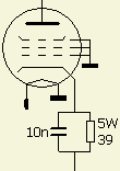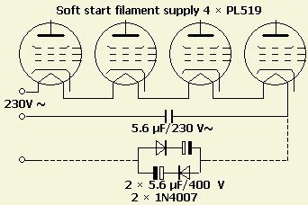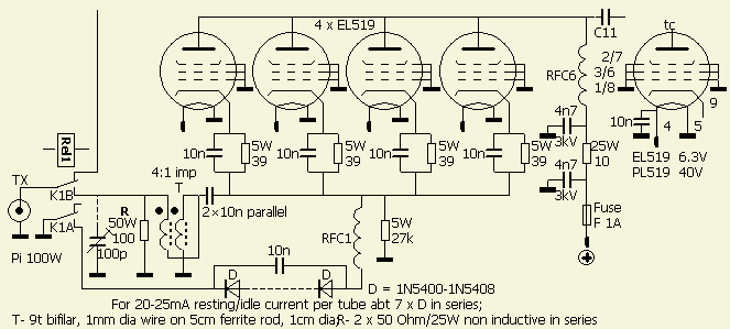 Each PL519 filament requires 40 VAC/0.3 A. In our circuit, the four filaments may be fed in series; with a ca pacitor of 5.6-6 μF/250 VAC added in series. The string may be connected directly to the 230 VAC (50 Hz) mains. If the chassis of the PA is earthen through the cable to the mains, this method is acceptable, with the added benefit of a gradually heating up of the filaments, i.e. without the thermal shock incurred by transformer feed. Because the cathodes are not at RF earth level, the filaments are by-passed to earth with capacitors.