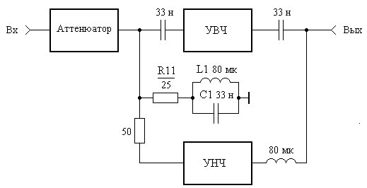 Рис.1 Функциональная схема пикосекундного усилителя Аттенюатор (рис. 2) реализован на основе двух полевых транзисторов типа АП326А, выходные емкости которых включены в фильтр нижних частот.