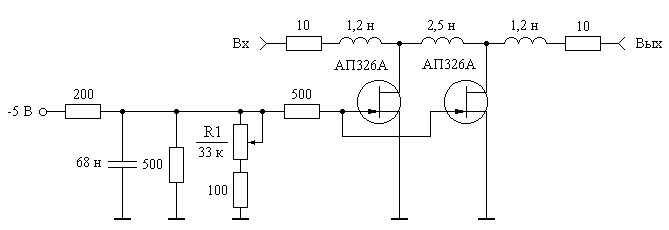 Рис.2. Принципиальная схема аттюнеатора Регулировка затухания аттенюатора осуществляется с помощью потенциометра R1. Транзисторы аттенюатора используются в режиме с управляемым сопротивлением канала при нулевом смещении исток-сток и подаче управляющего напряжения на затвор [1]. Такое включение позволяет реализовать диапазон регулировки усиления 8 дБ при сохранении коэффициента стоячей волны напряжения по входу не более 1,8. УВЧ пикосекундного усилителя (рис. 3) состоит из трех идентичных модулей на полевых транзисторах АП602А и выходного каскада на биполярном транзисторе КТ963А, разработанных на основе схемных решений описанных в [1, 2, 4, 5].