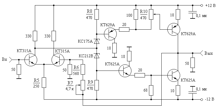 Рис.4. УНЧ пикосекундного усилителя Токи покоя транзисторов выходного каскада равны 80 мА, токи покоя остальных транзисторов УНЧ выбраны равными 20 мА. Настройка УНЧ по постоянному току сводится к подбору резисторов R5, R8, R9. Резистор R10 служит для выравнивания токов покоя транзисторов двухтактного каскада. Полоса рабочих частот УНЧ равна 0 – 5 МГц. Для выравнивания коэффициентов усиления высокочастотного и низкочастотного каналов пикосекундного усилителя, уменьшения дрейфа нуля и повышения стабильности работы, УНЧ охвачен общей отрицательной обратной связью (резисторы R6, R7). Частотно-разделительные цепи пикосекундного усилителя, с частотой стыковки 100 кГц, реализованы на основе схемного решения описанного в [3, 8]. Настройка пикосекундного усилителя заключается в следующем. Вначале производится поэтапная настройка модулей УВЧ, описанная в [2, 5], и настройка УНЧ, описанная в [7]. После выравнивания канальных коэффициентов усиления, на входе и выходе пикосекундного усилителя устанавливаются частотно-разделительные цепи. Варьируя величиной элементов R11, L1, C1 (рис. 1), минимизируются искажения формы импульсной характеристики усилителя, обусловленные использованием частотно-разделительных цепей. Технические характеристики пикосекундного усилителя постоянного тока: