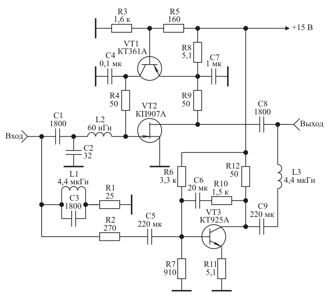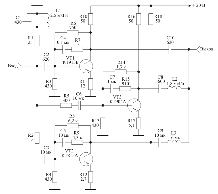 где M=fн УВЧ/fв УВЧ. На рис. 7 приведена принципиальная схема экспериментального макета трехканального варианта усилителя, реализованного на согласованных каскадах [9] по функциональной схеме представленной на рис. 6.