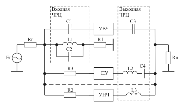 Рис.3. Схема двухканального усилителя Будем полагать, что УВЧ и УНЧ идеальны, а Rг=Rн=Rвх УВЧ=Rвх УНЧ=Rвых УВЧ =Rвых УНЧ . В этом случае, находя передаточную характеристику схемы в виде дробно-рациональной функции комплексного переменного p=j*