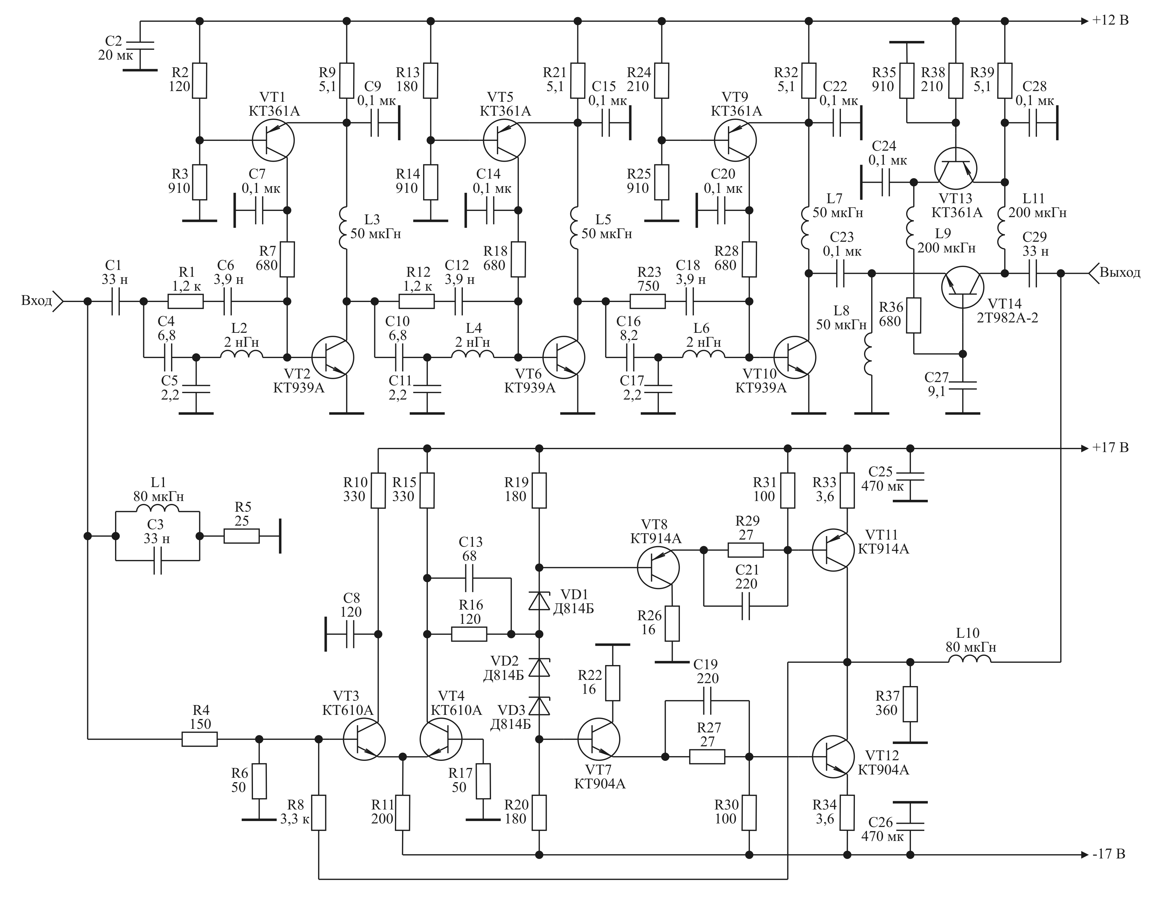 Рис.8. Импульсные характеристики усилителя Для примера рассчитаем значения элементов ЧРЦ рассматриваемого усилителя (рис. 7). В соответствии с выбранными fв УВЧ и fн УВЧ, коэффициент M=fн УВЧ/fв УВЧ= 10. Рассчитывая значения элементов ЧРЦ по соотношениям (2) получим: Несовпадение некоторых значений элементов схемы макета усилителя со значениями элементов, рассчитанными по соотношениям (2), обусловлено необходимостью компенсации влияния реальных параметров канальных усилителей на работу схемы. Принципы построения многоканальных импульсных усилителей с ЧРЦ реализованы в двухканальном сверхширокополосном усилителе мощности постоянного тока с характеристиками: полоса рабочих частот 0:1,5 ГГц; неравномерность АЧХ ±1,5 дБ; коэффициент усиления 15 дБ; номинальный уровень выходной мощности 2 Вт; время нарастания переходной характеристики 250 пс; длительность усиливаемых импульсов не ограничена; выброс переднего фронта импульса не более 10 %; искажения плоской вершины импульса не более 10 %; сопротивление генератора и нагрузки 50 Ом; частота стыковки ЧРЦ 100 кГц; напряжения источников питания ±17 В и +12 В; потребляемая мощность 30 Вт; габаритные размеры корпуса усилителя 190х120х40 мм. Принципиальная схема усилителя приведена на рис. 9. Рис.9. Принципиальная схема усилителя Канальные усилители сверхширокополосного усилителя разработаны с использованием достоинств схемных решений построения усилителей СВЧ и усилителей постоянного тока. Выходной каскад высокочастотного канала выполнен по схеме со сложением напряжений [10], входные каскады выполнены с использованием реактивных межкаскадных корректирующих цепей третьего порядка [11]. Во всех каскадах применена активная коллекторная термостабилизация [12]. Выходной каскад низкочастотного канала построен по двухтактной схеме на основе комплиментарных транзисторов КТ904А и КТ914А и работает от входного балансного каскада. Выравнивание коэффициентов усиления каналов и уменьшение дрейфа нуля достигается введением общей отрицательной обратной связи с помощью резистора R2. Установка заданных режимов работы транзисторов усилителя постоянного тока осуществляется резисторами R3-R5 . Для расширения полосы его рабочих частот использована высокочастотная коррекция с помощью конденсаторов C2-C4 . Компенсация влияния реальных параметров канальных усилителей на искажения, обусловленные двухканальной структурой устройства, осуществляется варьированием в небольших пределах значениями элементов R1, L1, C1. Таким образом, рассматриваемые схемные решения построения многоканальных импульсных усилителей с ЧРЦ позволяют минимизировать взаимное перекрытие рабочих частот канальных усилителей, осуществлять реализацию канальных усилителей с использованием достоинств схемных решений построения усилителей заданного частотного диапазона и повышение, благодаря этому, выходной мощности разрабатываемого устройства. ЛИТЕРАТУРА
