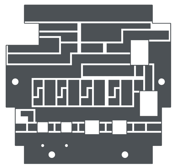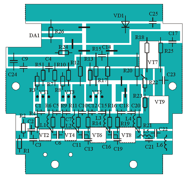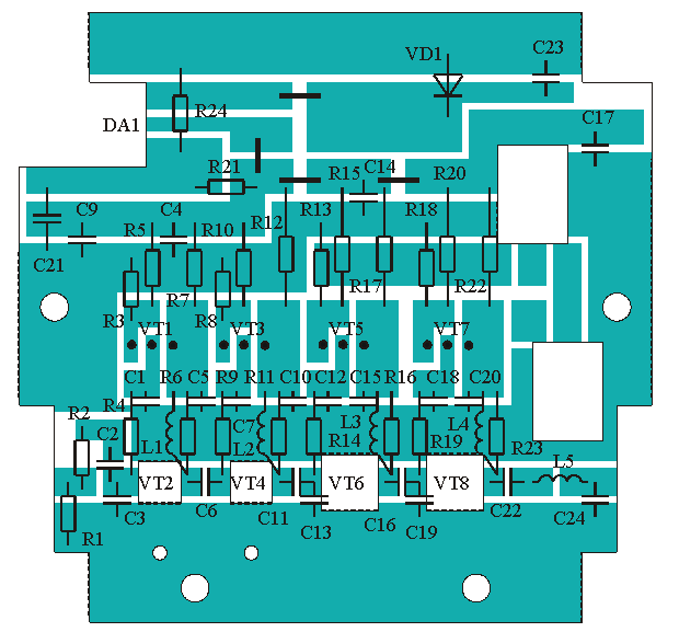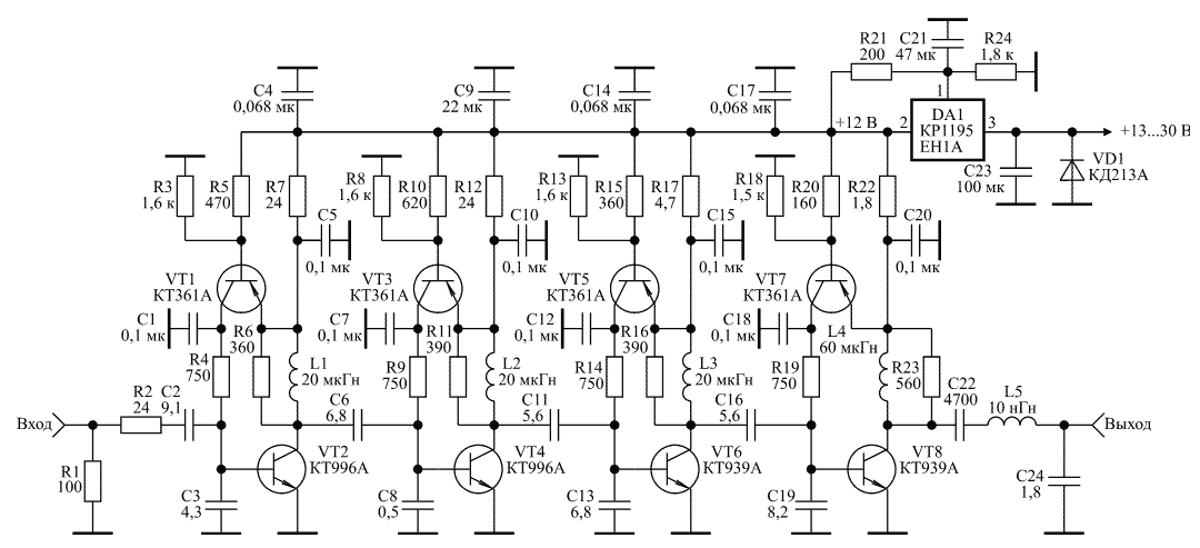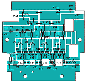 Задача построения линейки полосовых усилителей мощности перекрывающих диапазон частот в несколько октав может быть решена различными способами. Наиболее удобным представляется использование унифицированного усилителя, настройка которого на любой из поддиапазонов сводилась бы к изменению минимального числа элементов схемы. Это возможно при построении полосовых усилителей мощности на основе мощного сверхширокополосного усилителя, выходной каскад которого переводится в режим работы с отсечкой. В этом случае изменение рабочего диапазона частот полосового усилителя будет заключаться в перестройке выходного трансформатора сопротивлений, обеспечивающего реализацию оптимального сопротивления нагрузки транзистора выходного каскада. Рассматриваемая концепция построения полосовых усилителей мощности была использована при разработке мощного сверхширокополосного усилителя диапазона 20...1000 МГц. Принципиальная схема усилителя приведена на рис. 1. На рис. 2 приведена принципиальная схема перестраиваемого полосового усилителя мощности, в основу которого положена схема мощного сверхширокополосного усилителя приведенного на рис. 1. На рис. 3 приведен чертеж печатной платы, позволяющей осуществлять монтаж и настройку мощного сверхширокополосного усилителя (рис. 1), а затем его перестройку в полосовой усилитель мощности, схема которого дана на рис. 2. На рис. 4 и 5 показано размещение элементов мощного сверхширокополосного усилителя (рис. 1) и полосового усилителя мощности (рис. 2). На рис. 6 и 7 приведены фотографии настроенного мощного сверхширокополосного усилителя (рис. 1) и полосового усилителя мощности (рис. 2). Рис. 1. Принципиальная схема мощного сверхширокополосного усилителя Рис. 2. Принципиальная схема полосового усилителя мощности