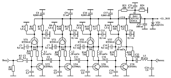 (Радиодело. – 2005. – № 11. – С. 40–43) Скачать всю статью в одном файле (PDF) Полосовые усилители мощности являются неотъемлемой составной частью практически любой радиотехнической системы и во многом определяют ее параметры. В статье описана конструкция и методика настройки полосового усилителя мощности, изменение рабочего диапазона частот которого сводится к перестройке выходного трансформатора сопротивлений, выполненного в виде полосового фильтра четвертого порядка. Такой подход позволил упростить и унифицировать задачу построения ряда полосовых усилителей мощности, перекрывающих диапазон частот 20...1000 МГц. Технические характеристики усилителя: