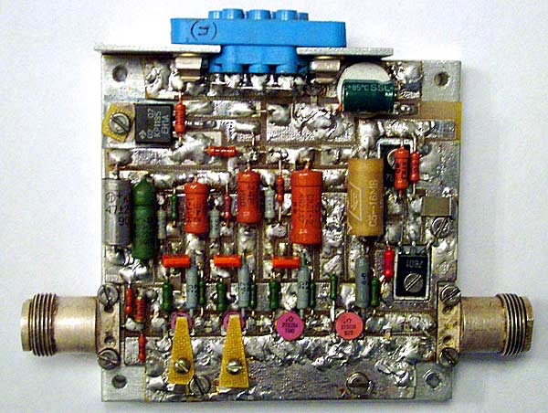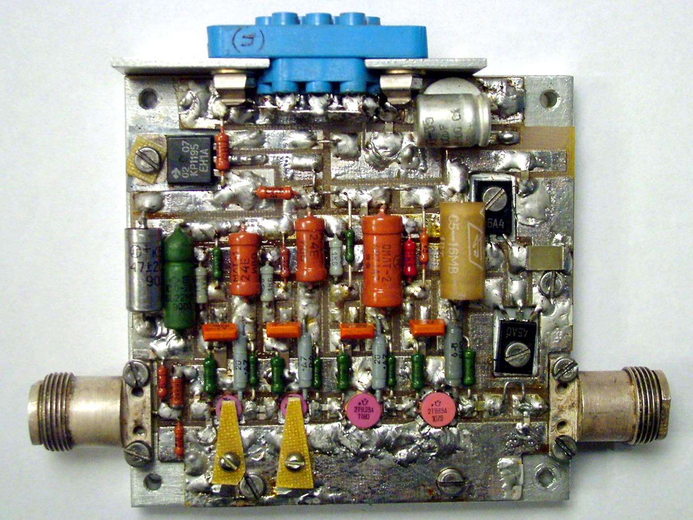 Рис. 6. Фотография мощного сверхширокополосного усилителя Рис. 7. Фотография полосового усилителя мощности Мощный сверхширокополосный усилитель (рис. 1) содержит четыре каскада усиления на транзисторах VT2, VT4, VT6, VT8, включенных по схеме с общим эмиттером. Все каскады усилителя работают в режиме класса А с токами покоя транзисторов VT2, VT4, VT6, VT8 равными 0,08; 0,12; 0,2; и 0,3 А соответственно. Во всех каскадах использована схема активной коллекторной термостабилизации [1]. Токи покоя транзисторов VT2, VT4, VT6, VT8 устанавливаются подбором номиналов резисторов R5, R10, R15, R20. Уменьшение указанных резисторов приводит к уменьшению токов покоя и наоборот. Во всех каскадах использованы реактивные межкаскадные корректирующие цепи третьего порядка [2, 3], где в качестве одного из элементов корректирующей цепи используется индуктивная составляющая входного сопротивления транзистора [3, 4]. В усилителе использованы безиндуктивные конденсаторы типа К10-42 в высокочастотном тракте и типа К10-17 в цепях фильтрации. Настройка усилителя состоит из следующих этапов. Вначале с помощью резисторов R5, R10, R15, R20 устанавливаются токи покоя транзисторов VT2, VT4, VT6, VT8. Для этого указанные резисторы поочередно заменяются потенциометрами и по измерениям напряжений на резисторах R7, R12, R17, R22 устанавливаются требуемые токи покоя указанных транзисторов. Затем впаиваются все элементы высокочастотного тракта за исключением конденсаторов С13, С19 и С24. На рис. 4 конденсатор С8 не указан, так как в качестве С8 используется металлизированная площадка, к которой припаивается база транзистора VT4. При включении усилителя без конденсаторов С13, С19 и С24 его амплитудно-частотная характеристика в режиме малого сигнала будет равномерна до частот 600...700 МГц с дальнейшим медленным спадом, составляющим на частоте 1000 МГц около 7...10 дБ. Подключением конденсаторов С13 и С19 следует выровнять амплитудно-частотную характеристику в области частот 700...1000 МГц. Технические характеристики настроенного мощного сверхширокополосного усилителя: выходная мощность 1...1,3 Вт; полоса рабочих частот 20...1000 МГц; коэффициент усиления 38 дБ; неравномерность амплитудно-частотной характеристики ±1,5 дБ. Перестройка мощного сверхширокополосного усилителя в полосовой усилитель мощности состоит из следующих этапов. Из сверхширокополосного усилителя (рис. 1) выпаиваются элементы схемы активной коллекторной термостабилизации выходного каскада R18, R19, R20, VT7 и устанавливаются элементы стабилизатора напряжения базового смещения (см. рис. 2, элементы R18, R19, R22, R23, R25, C23, VT7, VT9). Далее с помощью резистора R23 ток покоя транзистора VT8 устанавливается в пределах 20...60 мА. Методика расчета используемого стабилизатора напряжения базового смещения дана в [6]. Конденсатор C16 емкостью 5,6 пФ заменяется конденсатором емкостью 12 пФ. Это необходимо для облегчения режима работы предоконечного каскада, поскольку транзистор VT8 переводится в режим работы с отсечкой. После включения усилителя его выходная мощность должна остаться неизменной, то есть около 1...1,3 Вт во всем рабочем диапазоне 20...1000 МГц. Для повышения выходной мощности усилителя из схемы (см. рис. 1) следует удалить элементы C22, C24, L5 и на их место установить трансформатор сопротивлений (см. рис. 2, элементы L5, L6, C21, C22), обеспечивающий оптимизацию сопротивления нагрузки транзистора выходного каскада. Зн