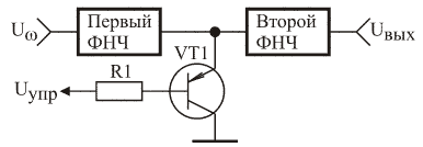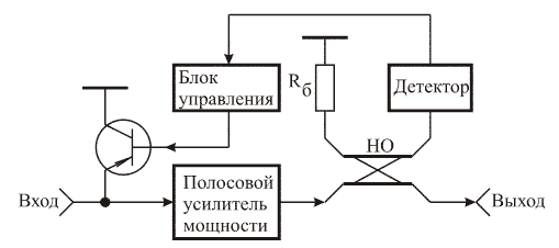 Рис. 1 Устройство защиты работает следующим образом. На базу транзистора с блока управления подается постоянное напряжение, запирающее оба перехода транзистора. На вход усилителя и одновременно на эмиттер транзистора подается переменное высокочастотное напряжение усиливаемого сигнала. Переменное высокочастотное напряжение делится между емкостями закрытых переходов база - эмиттер Cбэ и база - коллектор Cбк. На переходе база - коллектор выделяется переменное напряжение, амплитуда которого равна значению UвхCбэ/(Сбк+Сбэ), где Uвх - амплитуда переменного высокочастотного напряжения на входе усилителя. Значения емкостей закрытых переходов Сбк и Сбэ биполярных транзисторов отличаются незначительно [4]. Поэтому величина постоянного напряжения на базе транзистора устанавливается приблизительно равной половине амплитуды номинального значения входного напряжения. При воздействии на вход усилителя сигнала (или помехи), амплитуда напряжения которого превышает амплитуду номинального значения входного напряжения, в положительный полупериод воздействия переменного сигнала напряжение на эмиттере транзистора превышает напряжение на его базе. Переход база - эмиттер открывается, и через коллекторную цепь начинает протекать ток, равный aIэ [4], где а - коэффициент передачи эмиттерного тока, Iэ - ток эмиттера. Для мгновенного значения входного воздействия, превышающего номинальное значение, переход эмиттер - коллектор транзистора представляет собой двухполюсник с сопротивлением Rвх=Uвх/aIэ, которое составляет единицы Ом. В отрицательный полупериод воздействия переменного входного сигнала превышающего по амплитуде номинальное значение входного сигнала, открывается переход база - коллектор транзистора, и через транзистор начинает протекать ток равный aIIк , где aI - коэффициент передачи тока коллектора при инверсном включении транзистора, Iк - ток коллектора. Согласно [4], a ~~ aI. При отрицательной полуволне входного напряжения, амплитуда которого превышает амплитуду номинального входного напряжения, переход эмиттер - коллектор транзистора также представляет собой двухполюсник, сопротивление которого составляет единицы Ом. В этом случае мощное входное воздействие оказывается двухсторонне ограниченным. С увеличением рассогласования нагрузки усилителя с выходным сопротивлением НО (крайние степени рассогласования - короткое замыкание нагрузки и ее обрыв) напряжение, снимаемое с выхода отраженной волны НО, увеличивается, то есть на вход детектора подается напряжение пропорциональное напряжению, отраженному от нагрузки усилителя. При номинальной величине выходной мощности и при коэффициенте стоячей волны по напряжению со стороны нагрузки больше максимально допустимого значения, напряжение управления, подаваемое на базу транзистора с блока управления, начинает уменьшаться, уменьшая амплитуду входного воздействия, поступающего на вход усилителя. Поэтому мощность сигнала на выходе усилителя падает пропорционально росту коэффициента стоячей волны по напряжению нагрузки. Регулятор амплитуды мощных сигналов.Рассмотренные свойства биполярного транзистора могут быть использованы для построения регулятора амплитуды мощных сигналов. Предлагаемая функциональная схема регулятора приведена на рис. 2 [5], где Uw - регулируемый сигна