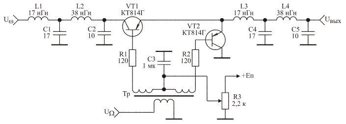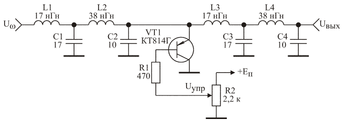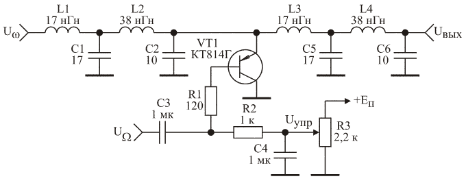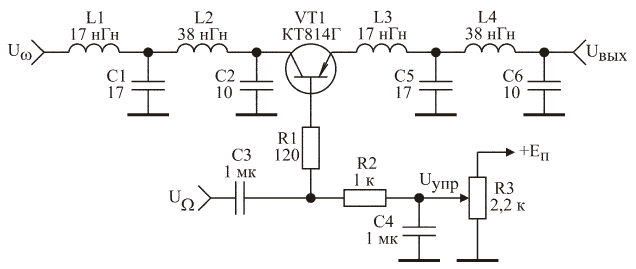 Рис. 2 Первый и второй фильтры нижних частот (ФНЧ) предназначены для подавления высших гармонических составляющих в спектре выходного сигнала, резистор R1 служит для уменьшения влияния изменяющегося в процессе регулирования выходного сопротивления источника напряжения управления на перераспределение напряжения высокочастотного сигнала на емкостях Сбэ и Сбк закрытого транзистора VT1. На рис. 3 приведена принципиальная схема регулятора амплитуды мощных сигналов, разработанного на основе его функциональной схемы (рис. 2), где Еп - источник напряжения. Элементы L1, C1, L2, C2 и L3, C3, L4, C4 образуют фильтры нижних частот с частотой среза равной 240 МГц. Резистор R2 предназначен для изменения напряжения управления.