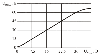 Рис. 3 Характеристики регулятора: максимальный уровень входной мощности, не менее 50 Вт; полоса рабочих частот 200:240 МГц; сопротивление генератора и нагрузки 50 Ом; область регулирования выходной мощности 0,04:46 Вт. На рис. 4 приведена экспериментально измеренная зависимость амплитуды выходного напряжения регулятора (рис. 3) от напряжения управления при амплитуде сигнала, подаваемого на вход регулятора, равной 70 В.
