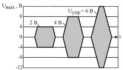 Рис. 5 На рис. 6 приведены экспериментальные зависимости формы огибающей амплитудно-модулированного колебания, подаваемого на вход регулятора (рис. 3), снятые при трех различных значениях напряжения управления (2, 4 и 6 В).