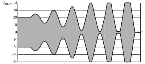 Рис. 7 Напряжение управления, в случае использования устройства (рис. 7) в качестве модулятора амплитуды, следует устанавливать равным примерно одной четвертой от значения амплитуды модулируемого сигнала. В этом случае, при отсутствии сигнала модуляции, напряжение на выходе будет равно одной второй от амплитуды модулируемого сигнала. На рис. 8 приведена экспериментальная зависимость формы огибающей сигнала на выходе устройства (рис. 7) при плавном увеличении напряжения модулирующего моногармонического сигнала частотой 10 МГц.