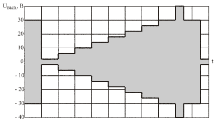 Рис. 8 При выборе частоты модуляции более 10 МГц появляются визуально заметные искажения формы огибающей выходного сигнала. Следует напомнить, что граничная частота коэффициента усиления тока базы fТ транзистора КТ814Г равна 3 МГц. На рис. 9 приведена экспериментальная осциллограмма огибающей сигнала на выходе устройства (рис. 7) в случае использования в качестве модулирующего сигнала тестового восьмиступенчатого телевизионного видеосигнала яркости, спектр которого занимает полосу частот 50 Гц...6,5 МГц.