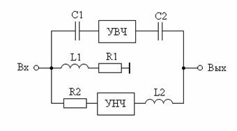 При разработке усилителей с рабочими частотами от нуля либо единиц герц до единиц гигагерц возникает проблема совмещения схемных решений построения низкочастотных и сверхвысокочастотных усилителей. Например, использование больших значений разделительных конденсаторов и дросселей питания для уменьшения нижней граничной частоты, связано с появлением некорректируемых паразитных резонансов в области сверхвысоких частот. Этого недостатка можно избежать, используя частотно-разделительные цепи (ЧРЦ). Наибольший интерес представляет схема усилителя с ЧРЦ, предназначенного для усиления как периодических, так и импульсных сигналов [15,16,17]. Схема усилителя с ЧРЦ приведена на рис. 8.1, где УВЧ - усилитель верхних частот, УНЧ - усилитель нижних частот.