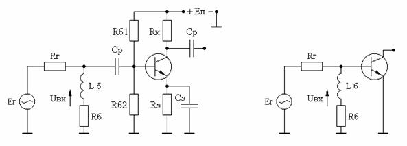 Принципиальная схема оконечного некорректированного усилительного каскада приведена на рис. 2.1,а, эквивалентная схема по переменному току - на рис. 2.1,б, где - разделительный конденсатор, - резисторы базового делителя, - резистор термостабилизации, - блокировочный конденсатор, - сопротивление в цепи коллектора, - сопротивление нагрузки.