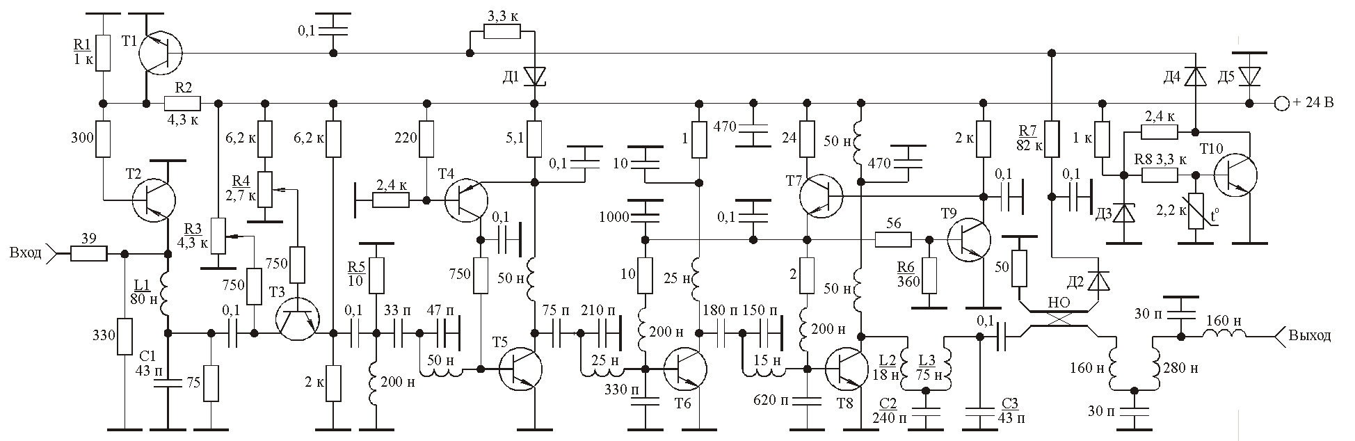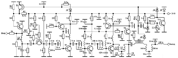 Высокие требования к линейности амплитудной характеристики полосовых усилителей мощности предъявляются при усилении телевизионных, однополосных, многочастотных, амплитудно-модулированных радиосигналов [1, 2]. Методы повышения линейности основаны на оптимизации базового смещения транзисторов усилителя, работающих в режиме с отсечкой коллекторного тока [3-5], использовании предыскажений входного сигнала [6-8] и адаптивной компенсации [8-10]. Несмотря на теоретические преимущества схем адаптивной компенсации [9], они достаточно сложны в реализации, поскольку содержат в своем составе такие элементы как синхронный детектор, направленные ответвители, линии задержки, управляемый аттенюатор, сумматор, усилитель искажений. Поэтому, например, в усилителях телевизионных передатчиков эти схемы не находят применения. Для реализации предыскажений входного сигнала используются корректоры, в качестве основного элемента которых может быть применен варикап [11]. Недостатком использования корректора на варикапе является невозможность осуществления плавной регулировки и подстройки его дифференциального коэффициента усиления [12]. На рис. 1 приведена принципиальная схема полосового усилителя мощности с корректором амплитудной характеристики на транзисторе. Рис. 1. Принципиальная схема полосового усилителя мощности с повышенной линейностью амплитудной характеристики. (Щелкните мышью для получения большого изображения) , Т1, Т10 - КТ315В, Т2 - КТ816А, Т3 - КТ630А, Т4 - КТ361В, Т5 - КТ913В, Т6 - КТ930А, Т7, Т9 - КТ817Б, Т8 - КТ971А; D1 - КС224Ж, D2,D4 - КД509А,D3 - КС215Ж,D5 - КД213А; НО – направленный ответвитель. Усилитель содержит корректор, три каскада усиления, фильтр нижних частот, схемы защиты от перегрузки по входу, от рассогласования по выходу, от превышения напряжением питания номинального значения, термозащиту. В качестве корректирующего элемента корректора использована управляемая нелинейная емкость коллектор-эмиттер Скэ закрытого низкочастотного транзистора Т3. Экспериментальные исследования зависимости емкости Скэ ряда транзисторов от напряжений на переходах коллектор-эмиттер Uкэ и база-эмиттер Uбэ показали следующее. В транзисторе с закрытыми переходами емкость Скэ практически не зависит от напряжения Uкэ, если это напряжение больше или равно двум вольтам. В случае дальнейшего уменьшения напряжения Uкэ значение емкости Скэ плавно нарастает. Скорость нарастания значения емкости Скэ, при этом, зависит от величины напряжения Uбэ и увеличивается с уменьшением указанного напряжения. Работа корректора основана на увеличении коэффициента его передачи при увеличении емкости Скэ. Потенциометром R3 устанавливается напряжение Uкэ, потенциометром R4 устанавливается напряжение Uбэ транзистора Т3. Резистор R5 обеспечивает линеаризацию скорости нарастания коэффициента передачи корректора при увеличении значения емкости Скэ. При условии, что амплитуда сигнала подаваемого на вход корректора меньше или равна значению Uкэ -2 В, сигнал на выходе корректора оказывается пропорциональным входному воздействию. Дальнейшее увеличение сигнала подаваемого на вход корректора приводит к увеличению среднего за период значения емкости Скэ и соответствующему увеличению коэффициента передачи корректора. Таким образом, изменением напряжения Uкэ можно регулировать величину линейно