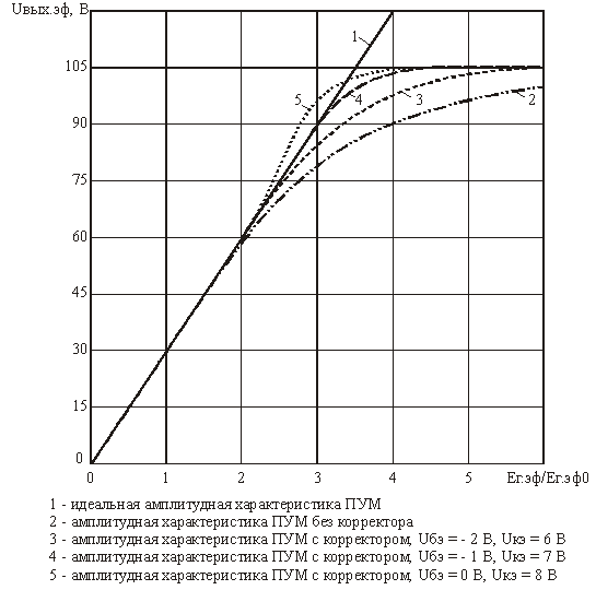 Рис. 2 Экспериментальные амплитудные характеристики усилителя. В процессе перестройки корректора происходит незначительное изменение коэффициента передачи усилителя. Кроме того, при отключенном корректоре коэффициент передачи усилителя возрастает на 21 дБ. Поэтому на рис. 2, для удобства сравнения линейности амплитудных характеристик усилителя при различных режимах его работы, по оси ординат отложено эффективное значение амплитуды первой гармоники сигнала в нагрузке Uвых.эф., а по оси абсцисс отложена эффективная амплитуда ЭДС источника сигнала Ег.эф., нормированная относительно своего значения , соответствующего величине напряжения Uвых.эф.= 30 В. Прямая 1 на рис. 2 соответствует идеальной амплитудной характеристике усилителя, кривая 2 – амплитудная характеристика усилителя при отключенном корректоре, кривая 3 – при напряжениях на транзисторе корректора Uбэ = -2 В, Uкэ = 6 В, кривая 4 – при напряжениях на транзисторе корректора Uбэ = -1 В, Uкэ = 7 В, кривая 5 – при напряжениях на транзисторе корректора Uбэ = 0 В, Uкэ = 8 В. Анализ характеристик приведенных на рис. 2 позволяет установить следующее. Предлагаемый корректор дает возможность плавно изменять наклон амплитудной характеристики усилителя в области больших напряжений, обеспечить постоянство дифференциального коэффициента усиления вплоть до выходного напряжения равного 85% от максимального значения, в два раза увеличить выходную мощность, ограниченную областью линейной работы усилителя. Технические характеристики усилителя: