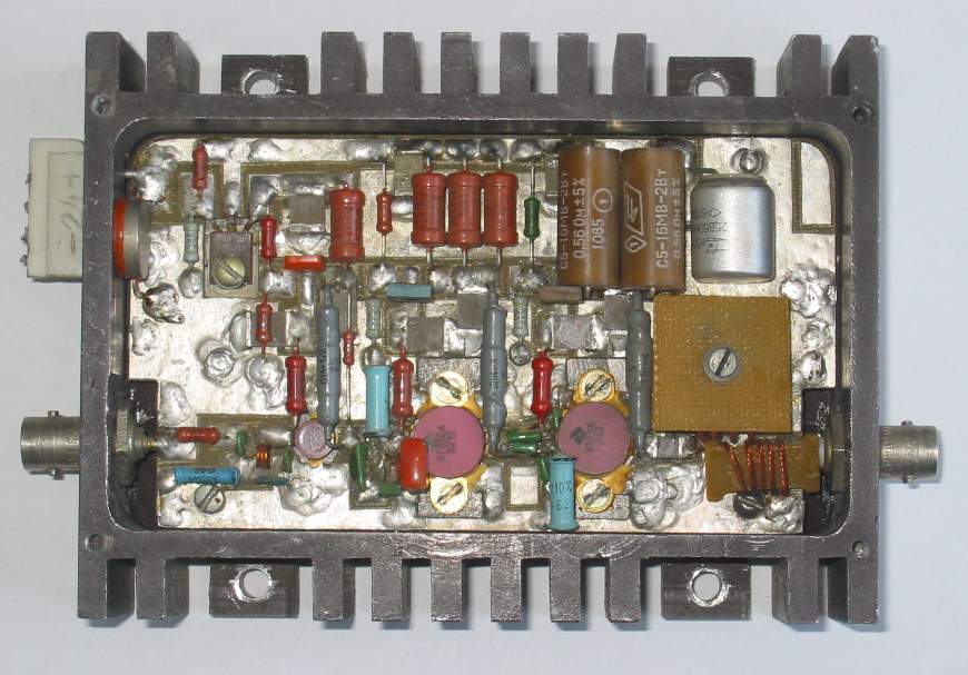 Принципиальная схема такого усилителя приведена на рис. 1. На рис. 2 приведен чертеж печатной платы, а на рис. 3 фотография внешнего вида усилителя. Рис 1. Принципиальная схема усилителя (щелкните мышью для увеличения) Усилитель содержит три каскада усиления на транзисторах VT2, VT5, VT7, трансформатор импедансов TP1, стабилизатор напряжения на транзисторе VT3. Все каскады усилителя работают в режиме с фиксированной рабочей точкой со следующими токами покоя: транзистор VT2– 0,4 А; VT5– 0,8 А; VT7– 2,5 А. Стабилизация токов покоя каскадов достигается благодаря применению активной коллекторной термостабилизации [1], а сами токи покоя устанавливаются подбором номиналов резисторов R4, R10 и R16. Увеличение номиналов этих резисторов приводит к увеличению токов потребления и наоборот. Во всех каскадах усилителя, кроме оконечного, использованы реактивные межкаскадные корректирующие цепи пятого порядка [2], где в качестве одного из элементов корректирующей цепи используется реактивная составляющая входного импеданса транзистора [3]. В оконечном каскаде использована корректирующая цепь третьего порядка [2]. Оптимальное сопротивление нагрузки мощного транзистора, на которое он отдает максимальную мощность, составляет единицы ом [4]. Поэтому между выходным каскадом и нагрузкой усилителя включен трансформатор импедансов ТР1 с коэффициентом трансформации 1:4, выполненный на ферритовом сердечнике М2000НМ 20х10х5 с использованием длинных линий с волновым сопротивлением 25 Ом и длиной 15 см. Длинные линии трансформатора изготовлены из четырех скрученных проводов марки ПЭЛ диаметром 0,25...0,35 мм. Методика изготовления длинных линий заключается в следующем. Берется два квадрата из стеклотекстолита со сторонами 3...4 см с просверленными дырочками в каждом из углов квадрата. В дырочки вставляются и закрепляются четыре провода. Один из квадратов закрепляется неподвижно, а второй вращается с помощью дрели. Для этого в его середине просверливается отверстие, в которое вставляется винт, вращающий квадрат. На сантиметр длины линии должно приходиться около четырех скруток. Затем от полученной четырехпроводной линии отрезается отрезок требуемой длины, и концы близлежащих проводов спаиваются между собой. На фотографии (рис. 3) видно, что ферритовое кольцо с намотанной на него длинной линией укрепляется в корпусе усилителя с помощью двух стеклотекстолитовых квадратов, между которыми это кольцо устанавливается. Следует иметь ввиду, что перед намоткой длинной линии на ферритовое кольцо его необходимо обмотать каким либо изолятором, например таким, какой применяется при изготовлении силовых трансформаторов. Транзистор VT3 стабилизатора напряжений укрепляется на основании с использованием слюдяной прокладки намазанной теплопроводной пастой. Это необходимо для изоляции коллектора транзистора VT3 от общей шины при одновременном сохранении его хорошей теплоотдачи. Транзисторы VT2, VT5, VT7 крепятся к основанию также с использованием теплопроводной пасты. Рис. 2 Чертеж печатной платы (щелкните мышью для увеличения) Печатная плата (рис. 2) размером 125х70 мм изготавливается из фольгированного с двух сторон стеклотекстолита толщиной 2-3 мм. Пунктирной линией на рис. 2 обозначены места металлизации торцов, что может быть сделано с помощью металлической фольги, которая припаивается к н