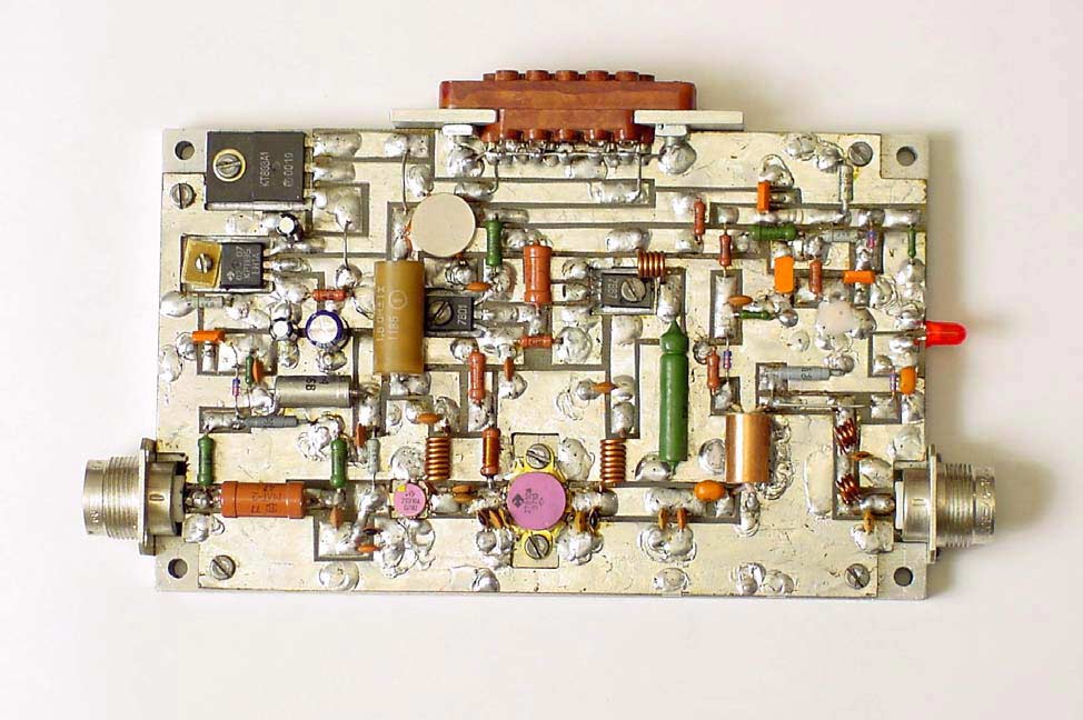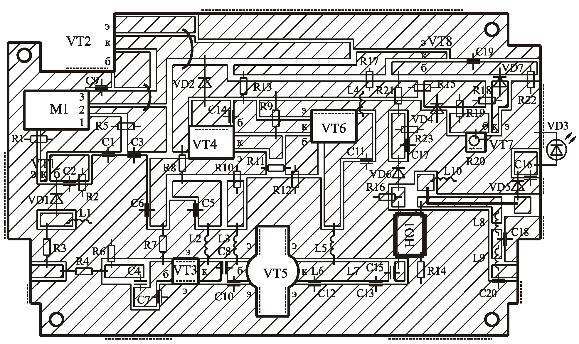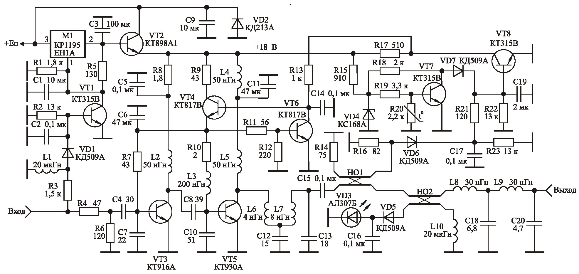 Рис. 1 Принципиальная схема сверхширокополосного усилителя (щелкните мышью для увеличения) На рис. 1 приведена схема усилителя мощности, обладающего перечисленными выше свойствами. На рис. 2 приведен чертеж печатной платы с расположением элементов, на рис. 3 –фотография внешнего вида усилителя.. Усилитель содержит два усилительных каскада; стабилизатор напряжения питания, стабилизатор базового смещения; трансформатор сопротивлений; два направленных ответвителя (НО); фильтр нижних частот; схемы защиты от перегрузки по входу, от рассогласования по выходу, термозащиту. На входе усилителя включен делитель напряжения на резисторах R4 и R6, обеспечивающий согласование входа усилителя с сопротивлением генератора. Стабилизатор напряжения на микросхеме M1 и транзисторе VT2 выдает стабильное напряжение питания усилителя равное +18 В при изменении напряжения источника питания Eп в пределах 20...32 В. Установка напряжения питания усилителя на заданное значение осуществляется резистором R5. Схема защиты усилителя от перегрузки по входу собрана на диоде VD1 и транзисторе VT1. При подаче на вход усилителя сигналов с амплитудой больше номинального значения детектор на диоде VD1 открывает транзистор VT1, что приводит к заземлению первой ножки микросхемы M1 и падению напряжения питания усилителя до 1...2 В. Порог срабатывания защиты по входу устанавливается выбором номинала резистора R3. Стабилизатор напряжения базового смещения на транзисторах VT4, VT6 используется для стабилизации угла отсечки транзисторов VT3 и VT5 усилителя при изменении уровня усиливаемого сигнала и температуры основания усилителя, на котором устанавливаются эти транзисторы. Кроме того, применение стабилизатора напряжения базового смещения позволяет осуществлять линеаризацию начального участка амплитудной характеристики разрабатываемого усилителя [1]. Требуемый угол отсечки устанавливается подбором номинала резистора R12. При отсутствии резистора R12 коллекторные токи каждого из транзисторов VT3 и VT5 составляют 10...40 мА. При подключении R12 напряжение на базе транзистора VT6 уменьшается и его выходное сопротивление по постоянному току растет, что приводит к увеличению базового смещения транзисторов VT3, VT5 и увеличению их коллекторных токов. Стабилизатор напряжения базового смещения используется также в качестве элемента управления коэффициентом усиления усилителя. При срабатывании защиты от рассогласования по выходу и термозащиты происходит открывание транзистора VT8 и уменьшение напряжения смещения на базе транзистора VT4 стабилизатора напряжения базового смещения. Угол отсечки транзисторов VT3 и VT5 в этом случае уменьшается, уменьшая, тем самым, коэффициент усиления усилителя. В случае полного открывания транзистора VT8 напряжение базового смещения оказывается равным нулю, и коэффициент усиления усилителя уменьшается до 2...5 дБ. Схема защиты от рассогласования по выходу состоит из направленного ответвителя НО1 и детектора на диоде VD6. С увеличением рассогласования нагрузки усилителя с его выходным сопротивлением (крайние степени рассогласования – короткое замыкание нагрузки и ее обрыв) напряжение, снимаемое с выхода отраженной волны направленного ответвителя НО1, увеличивается, то есть на вход детектора на диоде VD6 подается напряжение пропорциональное напряжению, отраже