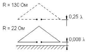 Скачать статью в одном файле (WORD, 300 кб) В нижней части декаметрового диапазона, для того чтобы решить вопрос о целесообразности применения той или иной конструкции антенны, необходимо в первую очередь рассмотреть возможности распространения излучаемых ею радиоволн. Простые антенны, не обладающие острой направленностью, излучают часть энергии вдоль земной поверхности, создавая так называемые земные или поверхностные лучи, а часть энергии - под различными углами возвышения, образуют так называемые пространственные лучи. При крутых углах пространственный луч проходит в ионосфере сравнительно небольшое расстояние и заметная доля энергии возвращается на землю. Фаза отраженного луча зависит от многих факторов, имеющих случайный характер, поэтому складываясь у поверхности земли с земным лучом, отраженный луч вызывает увеличение или уменьшение напряженности поля в месте приема. В диапазоне 160 метров максимум замираний сигнала наблюдается в радиусе 50-100 км, вокруг радиостанции, в следствии чего прием в этой зоне неустойчив. Для предотвращения замираний в ближней зоне антенны должны иметь слабое излучение в направлениях близких к вертикальному. Земная волна вблизи проводящей поверхности имеет вертикальную поляризацию, основной излучающей частью антенны должна быть ее вертикальная часть. Для получения наибольшей интенсивности излучения высота антенны должна быть возможно большей, а для того чтобы антенна была резонансной, имела хороший К.П.Д, размеры ее должны приближаться к 0,25l, это невозможно осуществить в любительских условиях для диапазона 160 метров. В результате приходится работать на короткие антенны, включая удлинительные катушки. Сопротивление излучения и К.П.Д. такой антенны оказываются низкими. При малом сопротивлении излучения, становится очень острой резонансная характеристика антенны, антенна очень критична в настройке, введение элементов настройки приводит к увеличению потерь и снижению К.П.Д. Вместо введения катушки индуктивности можно увеличить длину антенны до резонансной изогнув часть полотна под 90°. Антенна типа Г-образная или Т-образная. Общая длина провода Г-образной антенны равна четверти волны. Эффективность вертикальных Г-образных антенн можно улучшить, уменьшив излучение горизонтальной части. Это достигается тем, что ее провод изгибается так, чтобы образовались близкие участки с противоположным направлением тока. Чем больше взять согнутых секций, тем меньше они будут излучать. Одновременно сокращается протяженность горизонтальной части антенны. ![]() Иногда для улучшения распределения тока в вертикальной части антенны на ее конце создают сосредоточенную емкость, в виде зонта. Однако антенна с сосредоточенной емкостью много критичнее Г-образной в настройке и мало пригодна для работы в диапазоне частот. Если вертикальную антенну расположить так, чтобы ее нижний конец касался земли, она образует вместе со своим зеркальным изображением замкнутый симметричный вибратор, резонансная длина которого в 2 раза длиннее его геометрической высоты. Поэтому заземленную антенну называют четвертьволновым вибратором. Сопротивление излучения четвертьволнового несимметричного вибратора равно половине сопротивления излучения полуволнового диполя, то есть примерно 37 Ом. Это справедливо только в т