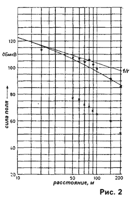 расстояниях хуже диполя на 30 дБ. Для сравнения приведен закон убывания