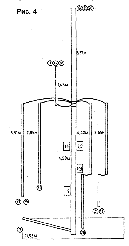 С помощью неоновой лампочки и измерителя ВЧ-тока были определены распределения тока и напряжения для каждого диапазона. На рис.4 приведены результаты с указанием соответствующих размеров. В кружках - максимумы напряжения, в прямоугольниках - максимумы тока.