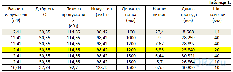 2.Далее. Используя ту же программу, рассчитаем параметры открытой катушки индуктивности 98,4мкГн с приемлемым диаметром 1,2 м для размещения на балконе или в квартире.