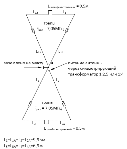 Стремление получить универсальную, многодиапазонную антенну привело к модернизации «Пирамиды». Как известно «Пирамида» является разновидностью петлевого вибратора или одной из распространенных свернутых рамочных антенн. Разместив соответствующим образом 4-х режекторных фильтров «трапов» получаем многодиапазонную антенну «Пирамида». С указанными размерами и параметрами «трапов» антенна работает от 10 до 80 метрового диапазонов (см. рисунок 1 и рисунок 2). Изготовление «трапов» не приводится.