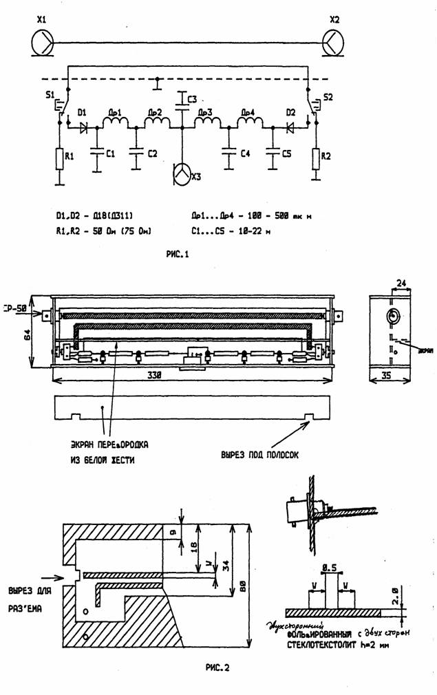 При мощности передатчика 100 Вт. напряжение в фидере питания составляет 87 вольт, при нагрузке 75 Ом. Значит, при измерении прямой волны напряжение на вторичной (измеряемой) линии, после выпрямителя составит, при связи - 39 d В на частоте 29 мГц. 0,97 в, и при связи - 62 dВ. в диапазоне 1,8 кГц, 0,07 в. При КСВ = 1 обратная (или отраженная) волна будет в 10 раз меньше. При изготовлении рефлектометра особое внимание уделить распайке экрана кабеля к разъему. На краях кабеля делается бандаж тонкой залуженной медной проволокой 0,15 мм, на длину 5 мм виток к витку. От края кабеля к разъему симметрично по кругу припаять 3-4 полоски медной фольги. Вторичная линия выводится из под оплетки кабеля (с одной и с другой стороны) на расстоянии 10 мм от края кабеля. По всей длине кабеля хорошо прижать оплетку обмотав ее изоляционной полихлорвиниловой лентой. Для измерения КСВ. при малой мощности (например между трансивером и усилителем) лучше применить рефлектометр в полосковом исполнении, с большей электрической длиной и большей связью между линиями. Так как диэлектрическая проницаемость стеклотекстолита больше чем у полиэтилена, то рефлектометр на полосках, выполненный на стеклотекстолите будет иметь большую электрическую длину, чем на РК - кабеле при тех же линейных размерах, а так же можно рассчитать необходимую степень связи между линиями. Ширина полоски зависит от заданной степени связи между линиями» толщины применяемого материала и его диэлектрической проницаемости. На рис.1 приведена принципиальная схема рефлектометра в полосковом исполнении. Для измерения падающей или отраженной волны необходимо переключить соответствующий микропереключатель. Измерительный прибор тестер или осциллограф подключают к измерительному выходу Х 3 экранированным кабелем. Несимметричные связанные линии довольно трудно рассчитывать, поэтому приводятся конкретные размеры скорректированные после измерений и проверки. Направленный ответвитель был изготовлен из двухстороннего фольгированного стеклотекстолита толщина 2 мм. Полосковые линии лучше вырезать самодельным резаком при травлении и нанесении краски в домашних условиях довольно трудно точно выдержать линейные размеры, как между полосками, так и по всей длине линий Необходимой точности можно добиться вырезая линии самодельным резаком, изготовленным из ножовочного полотна используя ниже описанное простое приспособление. Приспособление состоит из столика, двух металлических линеек упоров и четырех струбцин. В качестве столика используется прямоугольный лист алюминия 320 х 120 мм. толщиной 3 : 5 мм. Смотрите рисунок 3. Положить заготовку фольгированного стеклотекстолита на столик и прижать его к столику двумя струбцинами через линейку. На заготовке предварительно начертить карандашом примерное расположение полосковых линий, положить вторую линейку на крайнюю линию полоска и между линейками (с двух сторон) положить два набора концевых мер. Концевые меры, в каждом наборе, подобраны по размерам таким образом, чтобы прорезав первую линию и убрав по одной пластинке из каждого набора, мы передвинули вторую линейку на заданный размер полосковой линии W и прорезаем вторую линию и так далее. Таким образом мы очень точно можем прорезать 4 линии. Если нет возможности достать концевые меры, можно изготовить самодельные упо