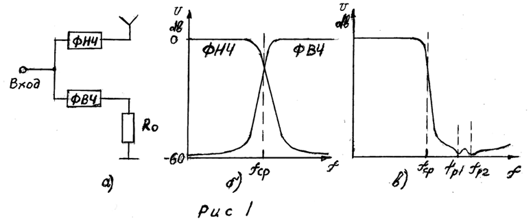 На рис. 1 приведена: а) функциональная схема; б) отдельные характеристики фильтров ФНЧ и ФВЧ; в) суммарная характеристика фильтра.