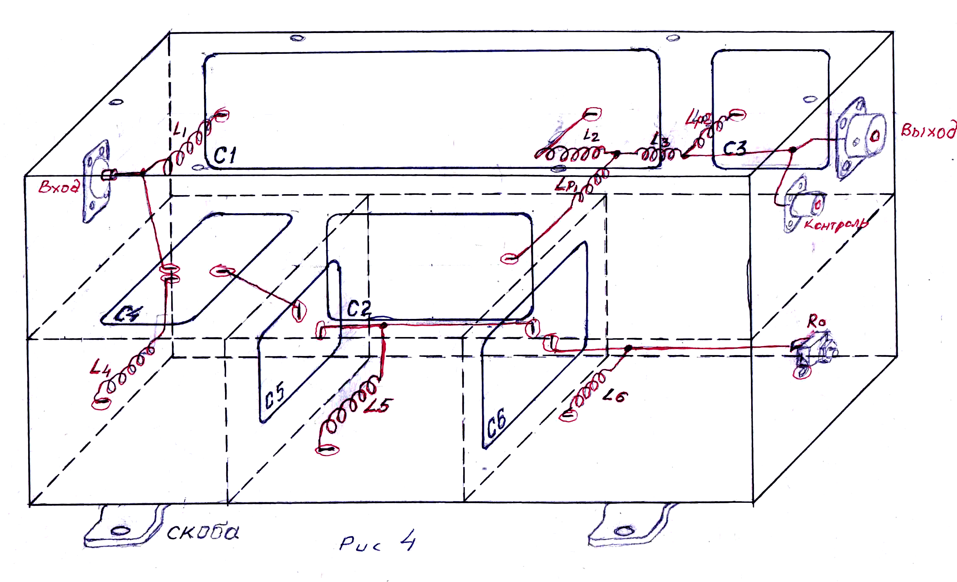 Примечание. Не путайте помехи по звуку от наводок сильного магнитного поля передатчика на различные катушки от динамиков, электромагнитные головки проигрывателей, некоторые виды телефонов и т.д. Борьба с такими помехами подробно описана в радиолюбительской литературе. Конструктивно фильтр выполнен из двустороннего фольгированного стеклотекстолита толщиной 1.5 мм, и представляет собой коробку разделенную внутри перегородками, которые пропаяны внутри и снаружи на стыках. В верхней части смонтирована ФНЧ секция фильтра, а в нижней части находится ФВЧ секция фильтра и нагрузочное сопротивление. Все конденсаторы выполнены на стенках и перегородках коробки путем вырезания на внутренней стороне фольги площадок соответствующих размеров. Перегородки внутри ФВЧ секции изготовлены из двухстороннего фольгированного текстолита толщиной 1 мм, на которых выполнены проходные конденсаторы.