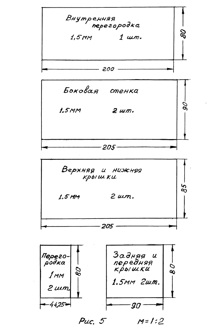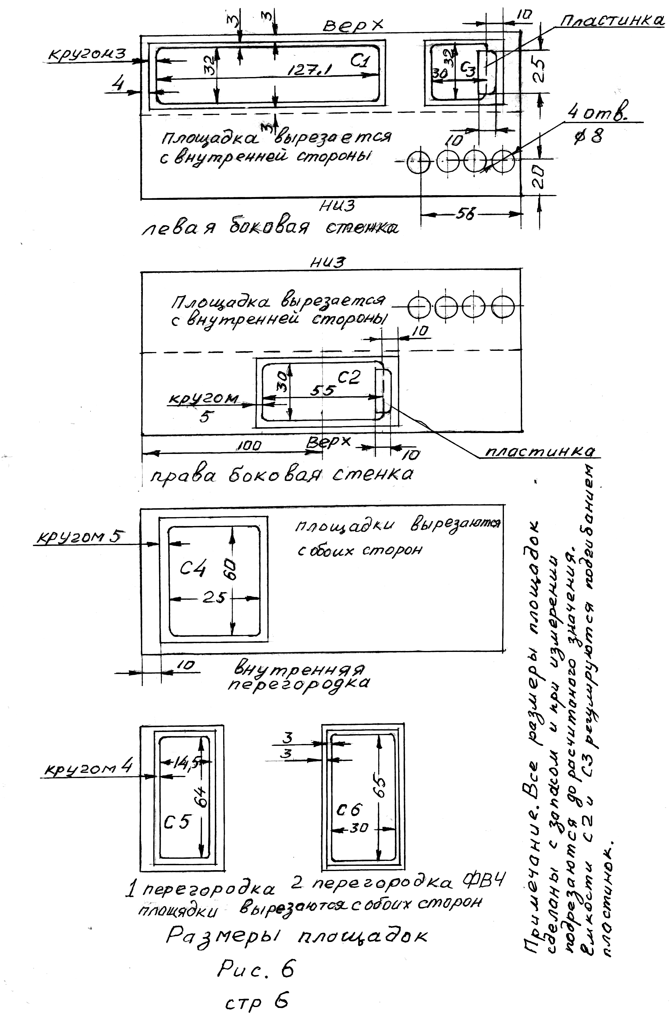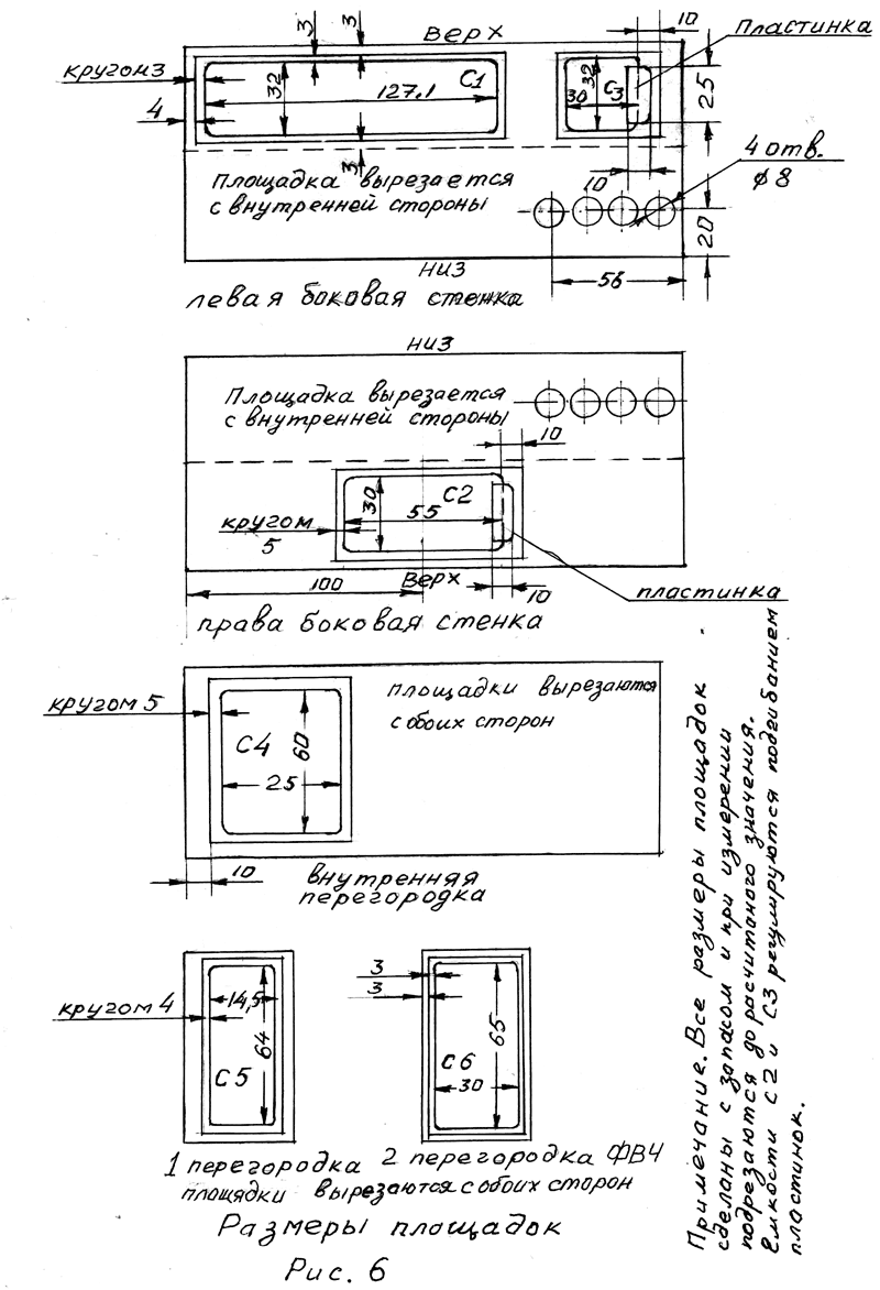 от одного варианта к другому, и общий размер коробки определяется именно этой Например: для варианта где: R0 – 50 Ом, а частота среза fср - 30 МГц, и где С6 = 148 пФ, что вызывает необходимость увеличивать перегородку и всю коробку. Катушки – бескаркасные, намотаны посеребренным или голым медным проводом (можно медной трубкой) диаметром 3 мм. Диаметр намотки - 20 мм. Рис. 4 показана конструкция и размещение деталей фильтра. Прежде чем приступить к изготовлению конденсаторов, необходимо определить удельную емкость на единицу площади фольгированного стеклотекстолита. Для этого на свободном куске с одной стороны чертят площадку, например 10 см на 10 см, отступают со всех сторон 4 мм, очерчивают, вырезают и отдирают скальпелем эту полоску. Оставшуюся фольгу вокруг площадки соединяют с фольгой на другой стороне проводом. Измерение проводят с возможно большей точностью приборами: Е 8-4; Р – 386; Р – 5016; MY613A и т. д. Рис. 5. Размеры всех деталей коробки для варианта “а”. У автора емкость 1 см2 получилась: 1 см2 = 3.45 pf для толщины 1.5 мм, и 4.96 pf – для 1 мм. Аналогичные измерения необходимо провести для стеклотекстолита толщиной 1 мм, для перегородок в ФВЧ секции. Далее с небольшим запасом на стенках и перегородках вырезают рассчитанные площадки, согласно рис 5, и путем подрезания уголков добиваются получения рассчитанных емкостей. Для емкостей С2 и С3 с правой стороны дорожку вырезают не 3 мм, а 13 мм. Это позволяет к площадке припаять мягкую полоску меди, сохранив зазор 5 мм (в крайнем случае, кусочек консервной луженой жести), отгибая или пригибая её можно в небольших пределах изменять емкость при точной настройке частот подавления помех телевидению. Не забывайте закруглить уголки!