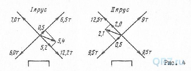 Для каждого яруса геометрическим суммированием горизонтальных составляющих может быть построена общая боковая сила, действующая на ствол мачты в этом ярусе (рис. 4). При правильно проведенных замерах тяжений боковые составляющие сил должны компенсироваться либо в разных ярусах (ствол испытывает изгибающее действие), либо другими факторами (ветер, наклон мачты).