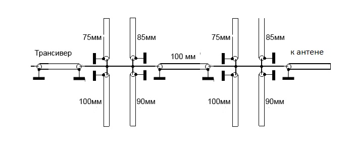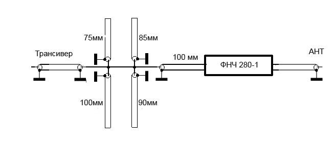Длинна отрезков кабеля рассчитывалась по формуле 300:FмГц:4 х 0,66 300 делим на частоту в мегагерцах получается длина волны, затем делим на 4 и умножаем на 0,66 получаем длину четверть волнового отрезок кабеля в мм с учетом коэффициента укорочения. Практически бывает достаточно подключить несколько отрезков кабеля без применения заводского ФНЧ 280-1 параллельно выходу трансивера и подрезать до исчезновения помехи (рассчитав длину отрезков по вышеприведенной формуле возмите отрезок на 10-15 мм длиннее и откусывайте по нескольку мм пока на данном канале не пропадет помеха. При отсутствии заводского ФНЧ 280-1 его можно заменить установкой дополнительных отрезков кабеля на расстоянии 1/4 длины воны от предыдущих отрезков (на место ФНЧ) при этом ослабление помехи может достигать 70дб