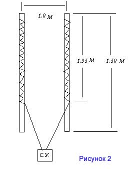 Хотя она и давала небольшой выигрыш на диапазоне 40 м, но не очень хорошо работала на диапазонах 30 и 20 м. В конце концов, после дополнительных испытаний, я вернулся к первоначальной схеме антенны рис. 2. Правда внес небольшие изменения в части длины намотанного на плечи провода. В окончательном варианте длина провода намотанного на каждую трубу составила 20,2 м.