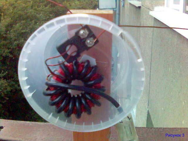 Согласующее устройство.Теперь о согласующем устройстве. В этой конструкции я применил согласующее устройство описанное в статье «Антенна на несколько диапазонов конструкции G5IJ» французского радиолюбителя Luc Pistorius F6BQU опубликованной на www.rf.atnn.ru/s10/antennes2-ru.html Описывать его конструкцию я не буду, она прекрасно расписана в статье. Единственное что я хочу заметить, это согласующее устройство предназначено для работы с вертикальными антеннами гораздо больших размеров и без противовесов. Для улучшения работы антенны моей конструкции я предусмотрел подключение противовеса, он подключается к общей точке соединения обмоток согласующего устройства, см. рис 3. Это дало возможность значительно уменьшить уровень как принимаемых, так и излучаемых помех. В качестве противовеса я использовал металлическое ограждение балкона.
