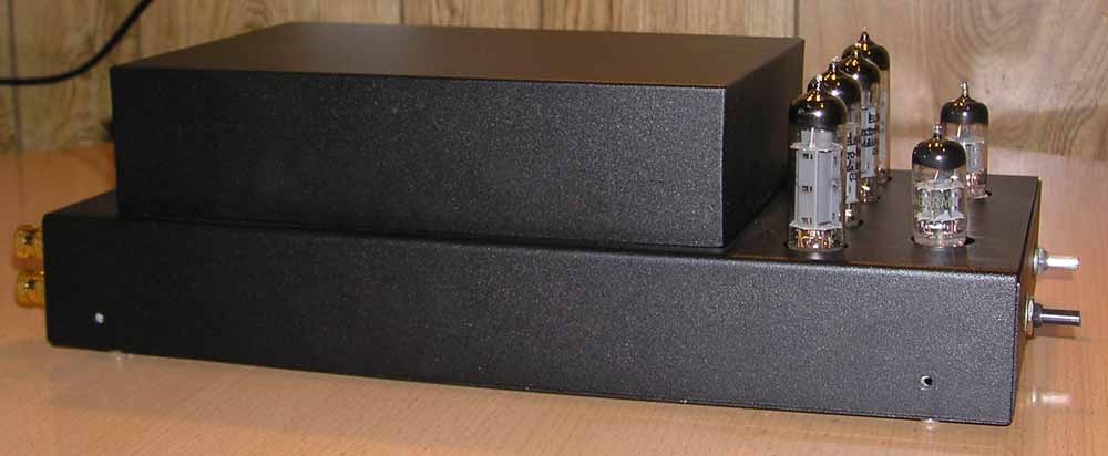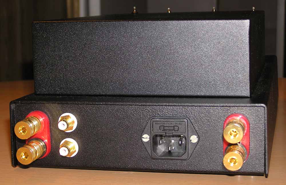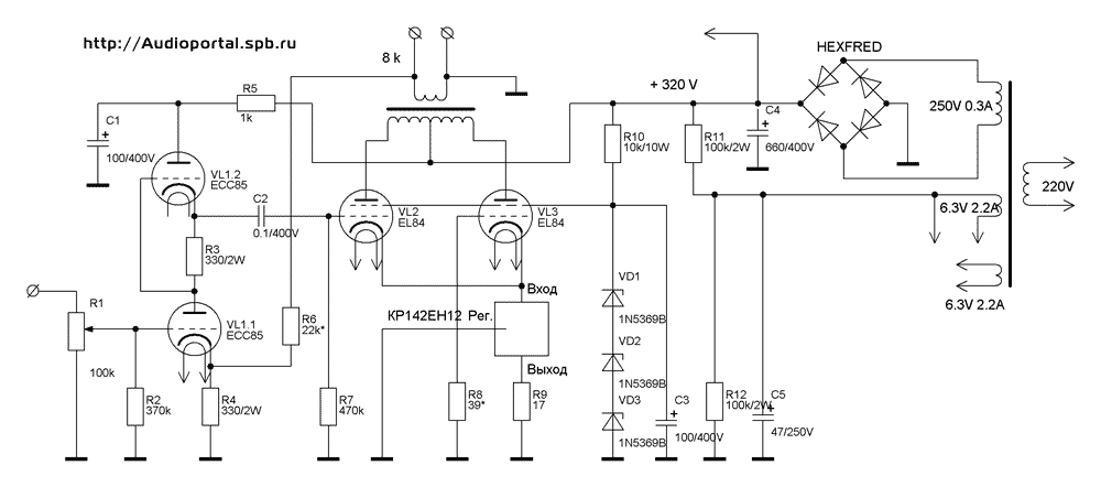 выходного сигнала, но, в принципе, можно обойтись и без него. Пара слов об ООС . Как вы знаете, выходное сопротивление пентодного усилителя очень велико и существенно превышает сопротивление нагрузки, так вот в данной ситуации применение ООС жизненно необходимо. Номинал резистора в цепи ООС вы можете подобрать по своему вкусу (в смысле по своему слуху), но мы бы рекомендовали ограничиться рамками 10 кОм - 24 кОм. Блок питания особенностей не имеет, единственное пожелание - не экономить на емкости конденсаторов фильтра. 680 - 800 мк будет вполне достаточно для обоих каналов. Вот собственно и все. Пожалуй, еще немного о монтаже : Если вы не уверены в правильности разводки земель при монтаже, воспользуйтесь "звездой". Этот вариант гарантировано позволит вам избежать ошибок. Центром "звезды" можете выбрать "земляные" выводы конденсаторов фильтра блока питания. Входные провода заземляются только в одной точке - у первой лампы. Неверный монтаж "земляных" проводов может существенно ухудшить глубину стереопанорамы, а нам ведь это не нужно? Так как это звучит ? Читая о других самодельных конструкциях, невольно закрадывается мысль, что перед вами лучший усилитель всех времен и народов, особенно этим "страдают" западные разработчики. Так вот: перед вами НЕ лучший усилитель, однако на наш взгляд, его звучание обладает рядом существенных достоинств: он очень детален и быстр, обладает высокой энергоемкостью, что позволяет усилителю убедительно передавать рок и другую "тяжелую" для маломощных ламп музыку. В отличие от классических пентодных усилителей, звук не напрягает, не вызывает утомления и обладает редко присущей пентодным двухтактникам мягкостью и деликатностью. Короче говоря, усилитель достаточно хорош для прослушивания любой музыки. Он действительно "всеяден", чего нельзя сказать об очень многих самодельных и промышленных конструкциях, а если учесть, что при безошибочном монтаже усилитель не требует настройки, то, пожалуй, это лучший выбор для начинающего любителя ламп, да и опытным "зубрам" мы бы посоветовали обратить на него внимание. P.S.: Будем очень признательны Вашим откликам и мыслям, пожеланиям и предложениям на нашем форуме по адресу http://AudioPortal.spb.ru/forum .