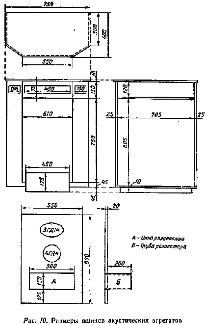 Ящики агрегатов изготовлены из столярной плиты толщиной 25 мм (боковые стенки) и фанеры толщиной 10 мм (верхняя крышка, перегородка высокочастотной части и дно). Акустические экраны для низкочастотных громкоговорителей изготовлены из столярной плиты толщиной 25 мм, а трубы резонаторов из фанеры толщиной 10 мм. Размеры ящиков акустических агрегатов указаны на рис. 10. Изнутри ящики проклеивают войлоком, поролоном, губчатой резиной или рубероидом. Можно также для внутренней обивки ящиков применить стеганую вату, которая крепится к стенкам ящиков с помощью реек.