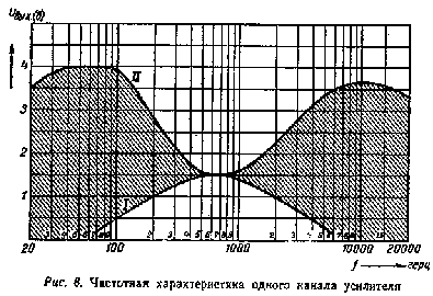 На рис. 8 приведена частотная характеристика одного канала усилителя. Глубина регулировки тембра и громкости усилителей достигает 16—20 дб в зависимости от усиливаемых частот (штриховкой показаны пределы регулировки) .