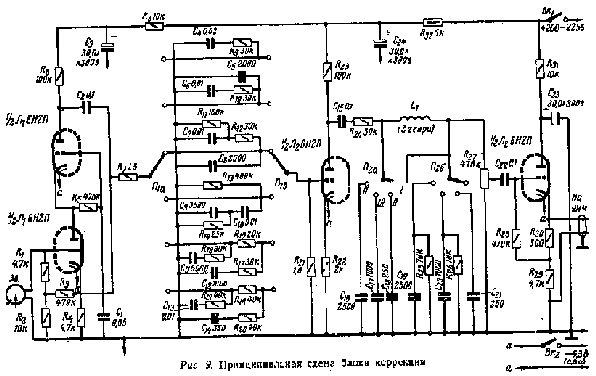 Принципиальная схема блока коррекции частотных характеристик для звукоснимателя показана на рис. 9. Первый каскад блока выполнен по каскодной схеме на лампе 6Н2П (Л1). Переключатель П1 служит для подбора частотной характеристики в зависимости от типа проигрываемых граммпластинок.