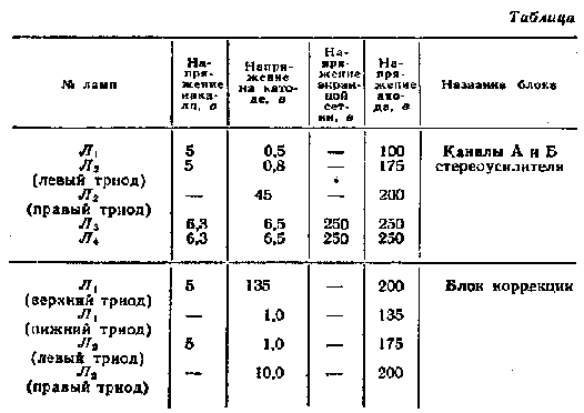 Катушка индуктивности L1 фильтра верхних частот намотана в карбонильном сердечнике типа СБ-5 (провод ПЭВ 0,07 до заполнения каркаса). При монтаже блока коррекции необходимо соблюдать те же правила, что и при монтаже стереоусилителя. Налаживание блока сводится к установке режима ламп, который приводится в таблице. Правильно смонтированный блок начинает работать без наладки.