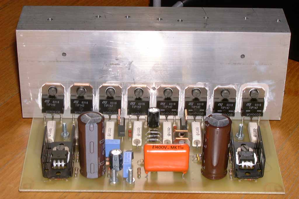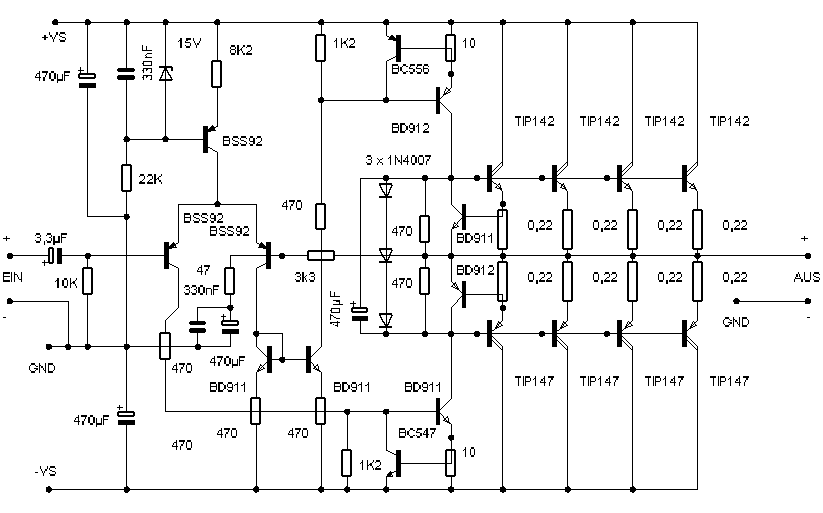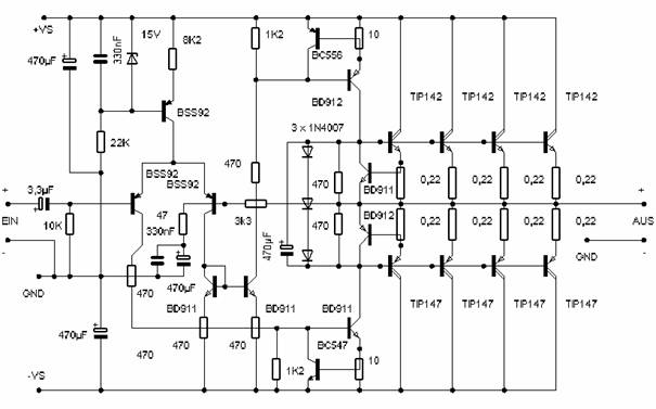 Предлагаю Вам интересную схему симметричного усилителя низких частот, найденную мною на немецком саите . По своим данным он мне сразу понравился, и я его собрал. Собраный из исправных деталий Фотографии этого усилителя можно посмотреть на странице Sym-Amp там можно и оригинальный текст почитать, Краткие характеристики усилителя:Мощность при 8Ом - 145Вт синус Усилитель можно нагрузить и на 2Ом ,необходимо только заменить сопротивления 0,33Ом на более мощные и понизить напряжение питания. Принципиальная схема:Детали: