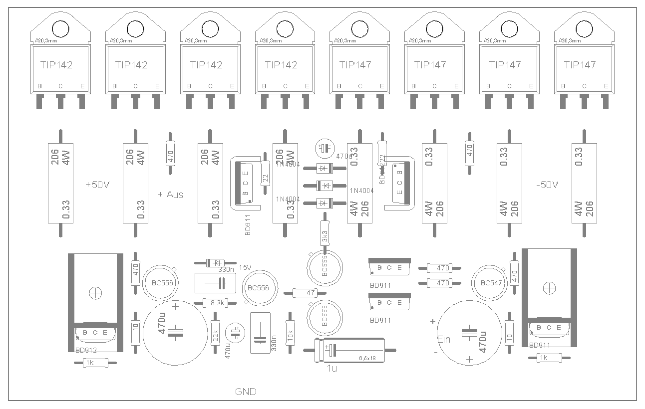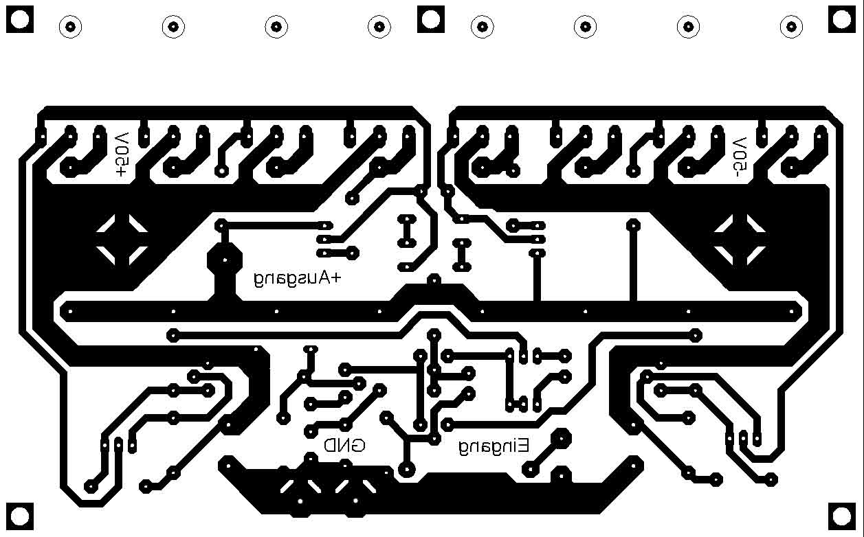 Печатная платаВид снизу Вид сверху Питание:Двухполярный источник питания с напряжением +- 25-50Вольт , в зависимости от необходимой мощности.Конденсаторы примерно по 10000-20000мф на плечо. Диодный мост на 15-25А.Трансформатор 2х18 – 2х35В.